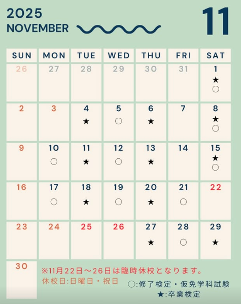 10月の予定表を掲載いたします。 検定日、休校日も記載されていますので、在校生の方だけではなくこれから入校をお考えの方もお役立てください。 応急救護学科実施日につきましてはお問い合わせ下さい。