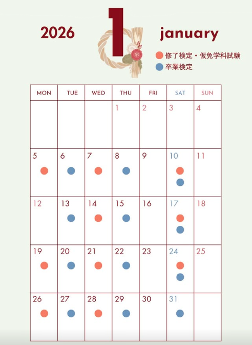 1月の予定表を掲載いたします。 検定日、休校日も記載されていますので、在校生の方だけではなくこれから入校をお考えの方もお役立てください。 応急救護学科実施日につきましてはお問い合わせ下さい。